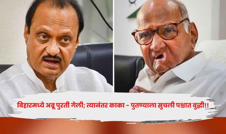 बिहारमध्ये अब्रू पुरती गेली; त्यानंतर काका – पुतण्याला सुचली पश्चात बुद्धी!! बिहारमध्ये अब्रू पुरती गेली; त्यानंतर काका फुटण्याला सुचली पश्चात बुद्धी!!, असंच म्हणायची वेळ पवार काका - पुतण्यांच्या प्रतिक्रियांवरून आली.Read More.. November 15, 2025