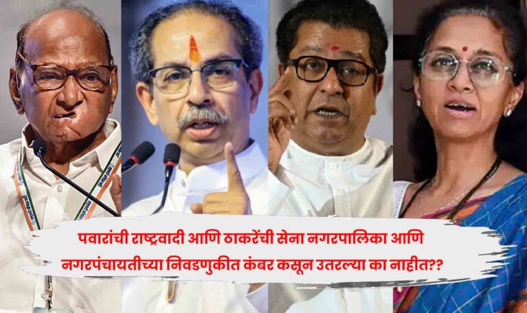 पवारांची राष्ट्रवादी आणि ठाकरेंची सेना नगरपालिका आणि नगरपंचायतीच्या निवडणुकीत कंबर कसून उतरल्या का नाहीत?? महाराष्ट्रातील नगरपंचायती, नगरपालिकांची निवडणूक शरद पवारांचे राष्ट्रवादी काँग्रेस आणि उद्धव ठाकरे यांची शिवसेना आणि काँग्रेस या तिन्ही पक्षांनी "सोडून" दिली.Read More.. November 30, 2025