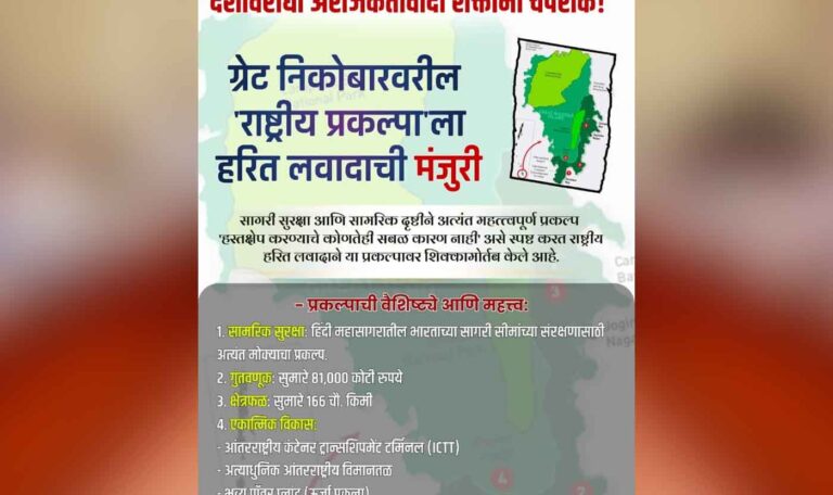 ग्रेटर निकोबार प्रकल्पासंदर्भात लिबरल मीडियाकडून जनसामान्यांचा बुद्धिभेद; नेमके वास्तव काय?? केंद्रातल्या मोदी सरकारने अविकसित राहिलेल्या पूर्व भारताकडे विशेष लक्ष पुरवून त्या परिसरात विविध विकास कामांना प्राधान्य दिले इतकेच नाहीRead More.. February 24, 2026