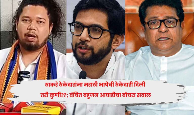 ठाकरे ठेकेदारांना मराठी भाषेची ठेकेदारी दिली तरी कुणी??; वंचित बहुजन आघाडीचा बोचरा सवाल ठाकरे ठेकेदारांना मराठी भाषेची ठेकेदारी दिली तरी कुणी??, असा सवाल वंचित बहुजन आघाडीचे युवा नेते सुजात आंबेडकर यांनी आज केला. सुजात आंबेडकर यांनी सोशल मीडिया हँडलवर सविस्तर पोस्ट लिहून ठाकरे बंधूंच्या राजकारणावर सडकून टीका केली.Read More.. March 30, 2026