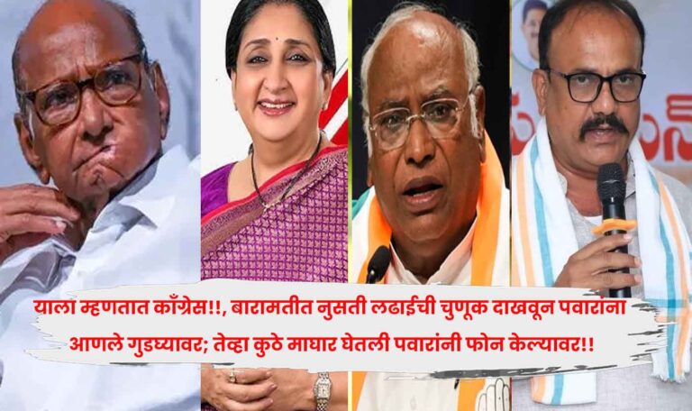 याला म्हणतात काँग्रेस!!, बारामतीत नुसती लढाईची चुणूक दाखवून पवारांना आणले गुडघ्यावर; तेव्हा कुठे माघार घेतली पवारांनी फोन केल्यावर!! याला म्हणतात काँग्रेस!!, नुसती लढाईची चुणूक दाखवून पवारांना आणले गुडघ्यावर!!, तेव्हा कुठे माघार घेतली पवारांनी फोन केल्यावर!!, हेच राजकीय वास्तव बारामती विधानसभेच्या पोटनिवडणुकीच्या आजच्या म्हणजे ९ एप्रिल २०२६ या दिवशी समोर आले.Read More.. April 9, 2026