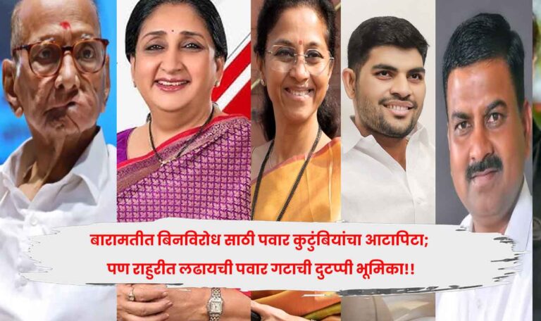 बारामतीत बिनविरोध साठी पवार कुटुंबियांचा आटापिटा; पण राहुरीत लढायची पवार गटाची दुटप्पी भूमिका!! बारामतीत बिनविरोध साठी पवार कुटुंबियांचा आटापिटा; पण राहुरीत लढायची पवार गटाची दुटप्पी भूमिका!!, हेच राजकीय वास्तव आज पोटनिवडणुकीचे अर्ज मागे घेण्याच्या दिवशी समोर आली.Read More.. April 9, 2026