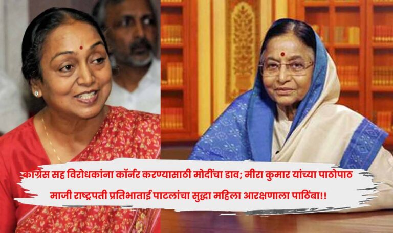 काँग्रेस सह विरोधकांना कॉर्नर करण्यासाठी मोदींचा डाव; मीरा कुमार यांच्या पाठोपाठ माजी राष्ट्रपती प्रतिभाताई पाटलांचा सुद्धा महिला आरक्षणाला पाठिंबा!!संसदेच्या विशेष अधिवेशना नारीशक्ती वंदन अधिनियम अर्थात महिला आरक्षण मंजूर करून घेण्यासाठी पंतप्रधान नरेंद्र मोदींनी पुन्हा एकदा नवा डाव टाकला.Read More.. April 15, 2026