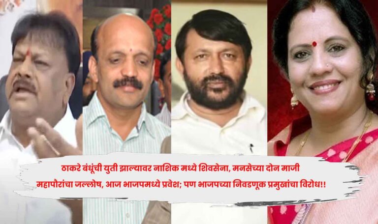 ठाकरे बंधूंची युती झाल्यावर नाशिक मध्ये शिवसेना, मनसेच्या दोन माजी महापौरांचा जल्लोष, आज भाजपमध्ये प्रवेश; पण भाजपच्या निवडणूक प्रमुखांचा विरोध!! ठाकरे बंधूंची युती झाल्यानंतर नाशिक फार मोठे राजकीय नाट्य घडले. शिवसेना आणि मनसेच्या दोन माजी महापौरांनी काल मोठा जल्लोष केला.Read More.. December 25, 2025