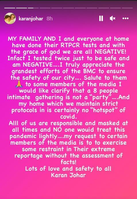 सर्वांनी करण जोहरच्या घरी झालेल्या पार्टीला प्रचंड ट्रोल केले होते. यानंतर करण जोहरने आपल्या घरातील सर्व व्यक्तींची आणि स्वतःची कोरोना टेस्ट केली आहे. ती निगेटिव्ह आली आहे.