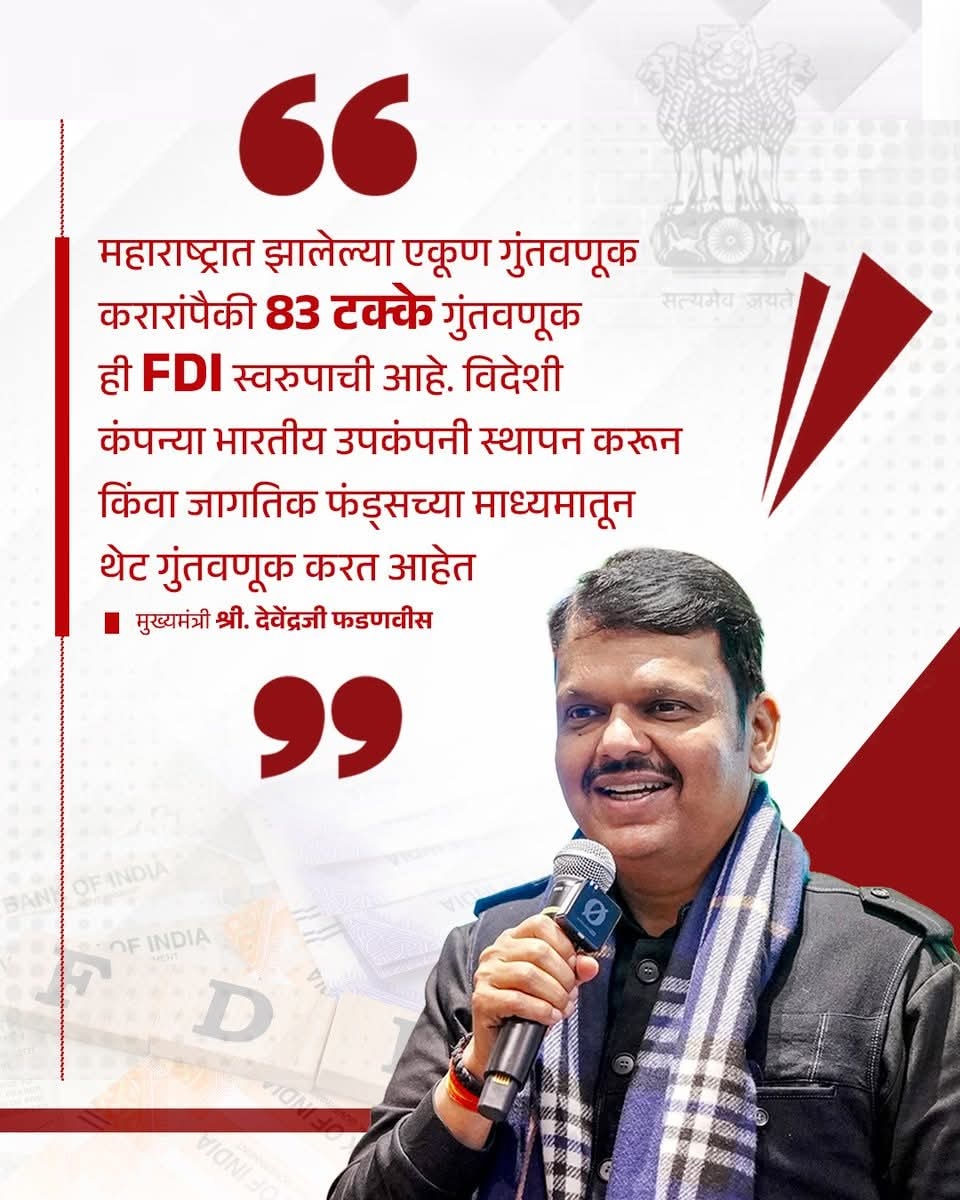महाराष्ट्रात झालेल्या एकूण गुंतवणूक करारांपैकी 83 % गुंतवणूक ही FDI स्वरुपाची आहे. विदेशी कंपन्या भारतीय उपकंपनी स्थापन करून किंवा जागतिक फंड्सच्या माध्यमातून थेट गुंतवणूक करत आहेत.