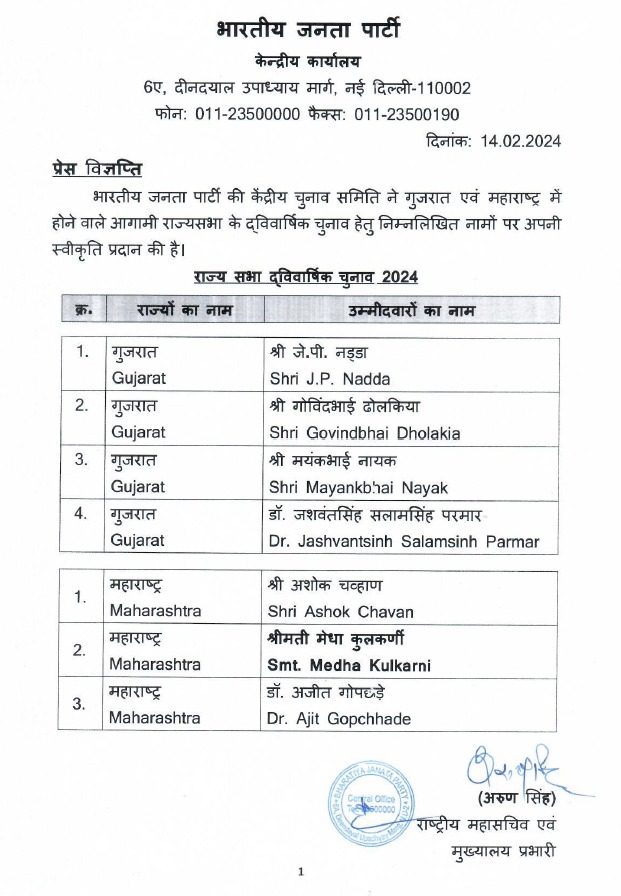 त्याचबरोबर भाजपचे राष्ट्रीय अध्यक्ष जे. पी. नड्डा, गोविंदभाई ढोकलिया, मयंक नायक आणि जशवंतसिंह परमार यांना गुजरात मधून राज्यसभेवर पाठवण्याचे निश्चित केले आहे.