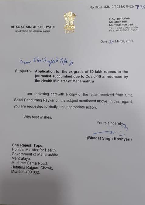 ३० मार्च २०२१ रोजी राज्यपाल भगत सिंह कोश्यारी यांनी आरोग्य मंत्री राजेश टोपे यांना याबाबत पत्र पाठवले असून लवकर घोषणा केलेली मदत देण्याबाबत सांगितलं आहे. मात्र आजपर्यंत कोणतीही कार्यवाही झाली नाही.