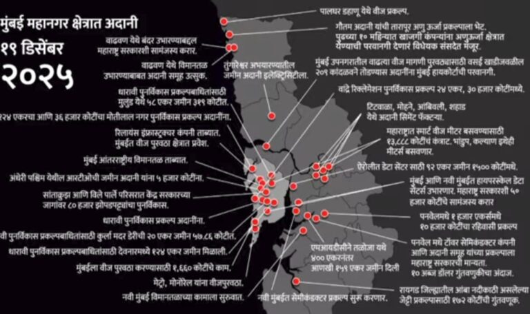 राज ठाकरे यांनी भाषणाची सुरुवातच गौतम अदानी हे गेल्या 10 वर्षांत कसे श्रीमंत झाले, यांचे भारताच्या नकाशावरचे प्रेझेंटेशन करून केली. 2014 पासून 2024 पर्यंत केंद्र आणि महाराष्ट्र सरकारने एकट्या गौतम अदानींवर कृपा केली आणि त्या अदानींनी महाराष्ट्र सह संपूर्ण देश गिळला, असा आरोप नकाशा दाखवून केला. गेल्या दहा वर्षात गौतम अदानींनी संपूर्ण देशभरात दीडशे पेक्षा जास्त प्रकल्प उभे केल्याचे यातून दिसून आले. केंद्रातल्या मोदी सरकारने आणि राज्यातल्या फडणवीस सरकारने एकट्या अदानींवर जमिनींचा वर्षाव केला लाखो हेक्टर जमीन एकट्या अदानींना दिली आणि त्यांनी सगळीकडे गुजरात्यांचा प्रभाव निर्माण केला, असा आरोप राज ठाकरे यांनी केला.