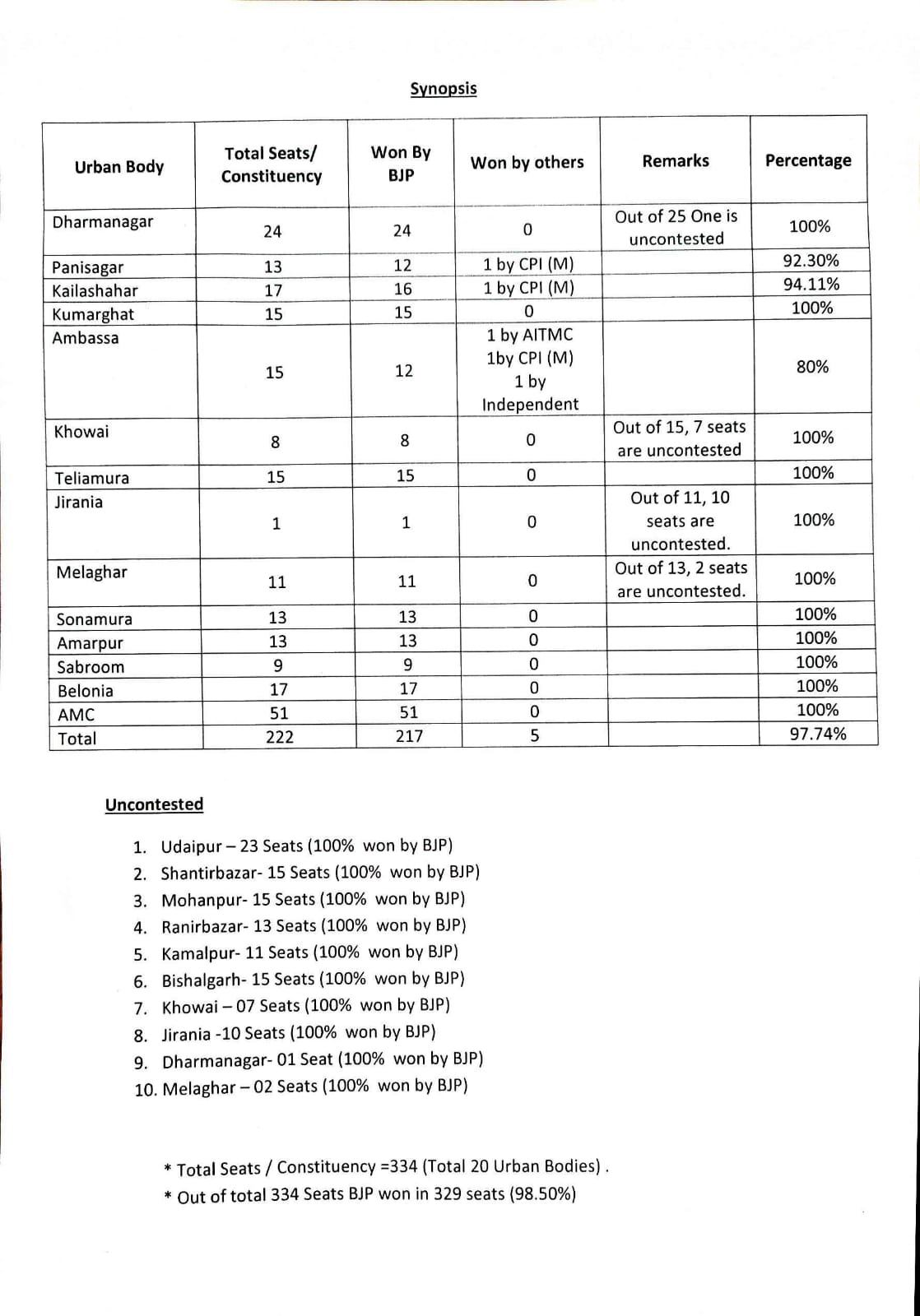 तिथल्या एकही जागेवर विरोधी उमेदवारच नव्हते. आगरतळा महापालिकेसह उरलेल्या 14 नगरपंचायतींमध्ये भाजपला 98% यश मिळाले आहे. आगरतळा महापालिकेच्या 51 पैकी 51 जागा भाजपने जिंकल्या आहेत.