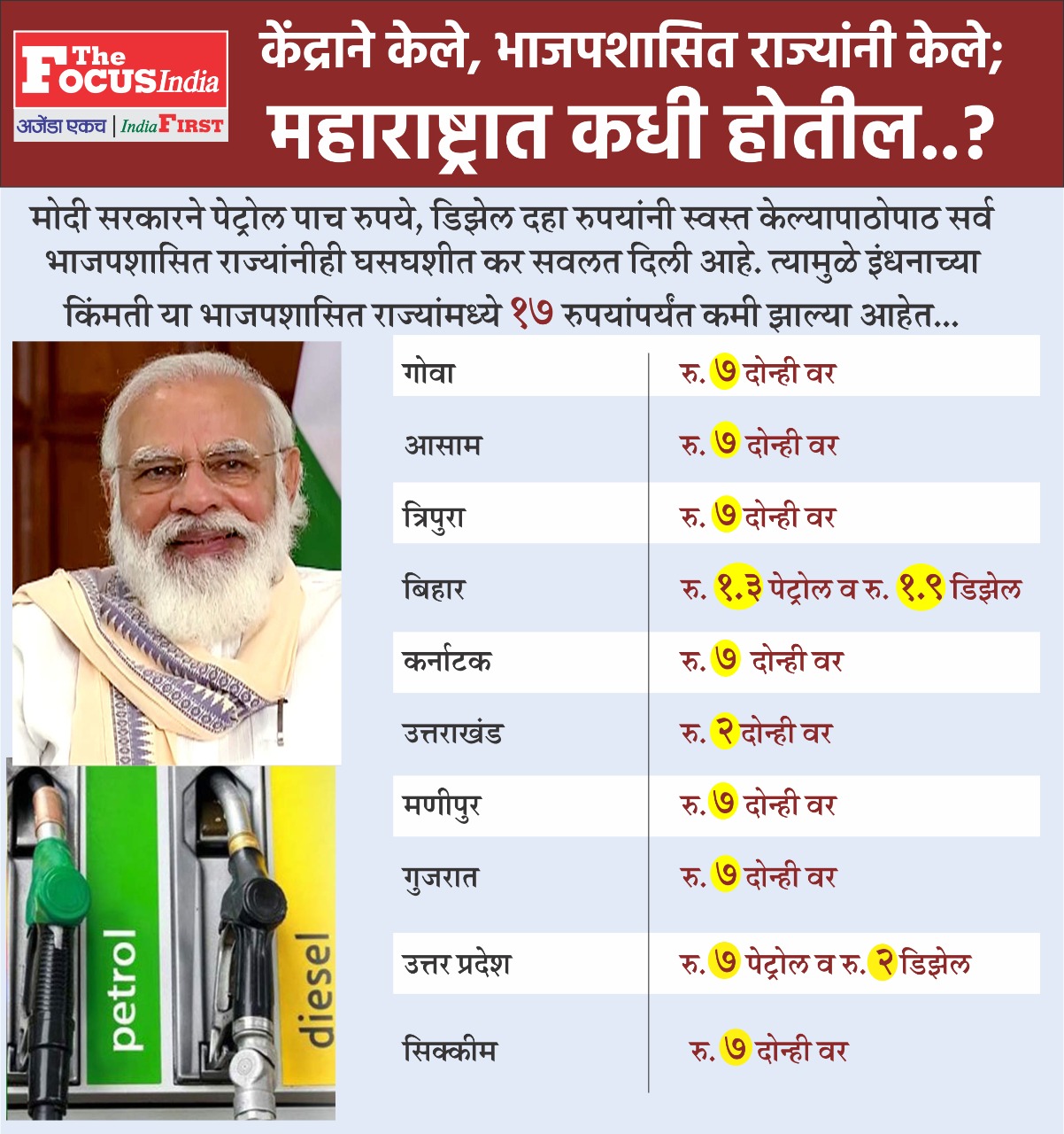 केंद्र सरकारने पेट्रोल डिझेल वरचे उत्पादन शुल्क कमी केल्यानंतर उत्तर प्रदेश, अरुणाचल प्रदेश, मध्य प्रदेश, ओरिसा, बिहार, त्रिपुरा, आसाम, गुजरात, उत्तराखंड आदी राज्यांनी आपापल्या हिशेबानुसार मूल्यवर्धित कर अर्थात व्हॅट कमी केला. त्यामुळे संबंधित राज्यांमध्ये पेट्रोल, डिझेलचे भाव आणखी कमी होण्यास मदत झाली. हे भावा आता या राज्यांमध्ये 10.00 ते 15.00 रुपयांच्या रेंजमध्ये कमी झाले आहेत.
